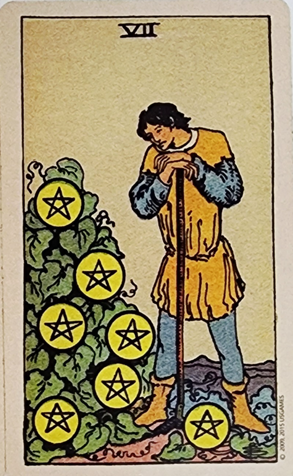 펜타클 7번은 '기다림', '성과의 지연', '중간 점검'의 의미를 지닌다.
